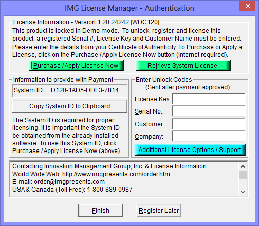 To quickly and easily license the software (on a system that has internet access), simply click on the "Purchase / Apply License Now" button. Once connected to IMG's website, you will be asked to enter billing information and payment information. Once paid, your order will be processed, and you will receive a confirmation e-mail and a separate e-mail with license information. Once the order is fully processed, you can then click the "Retrieve Purchased License" button to automatically license your system.